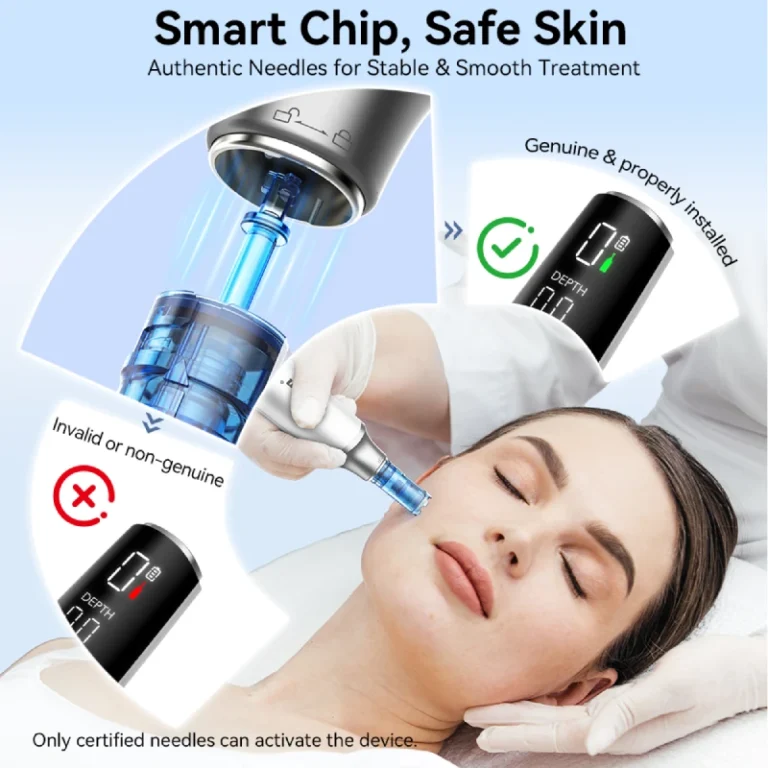 Six speed levels and adjustable needle depth (0-2.5mm) enable users to customize their experience based on personal comfort and skincare goals.